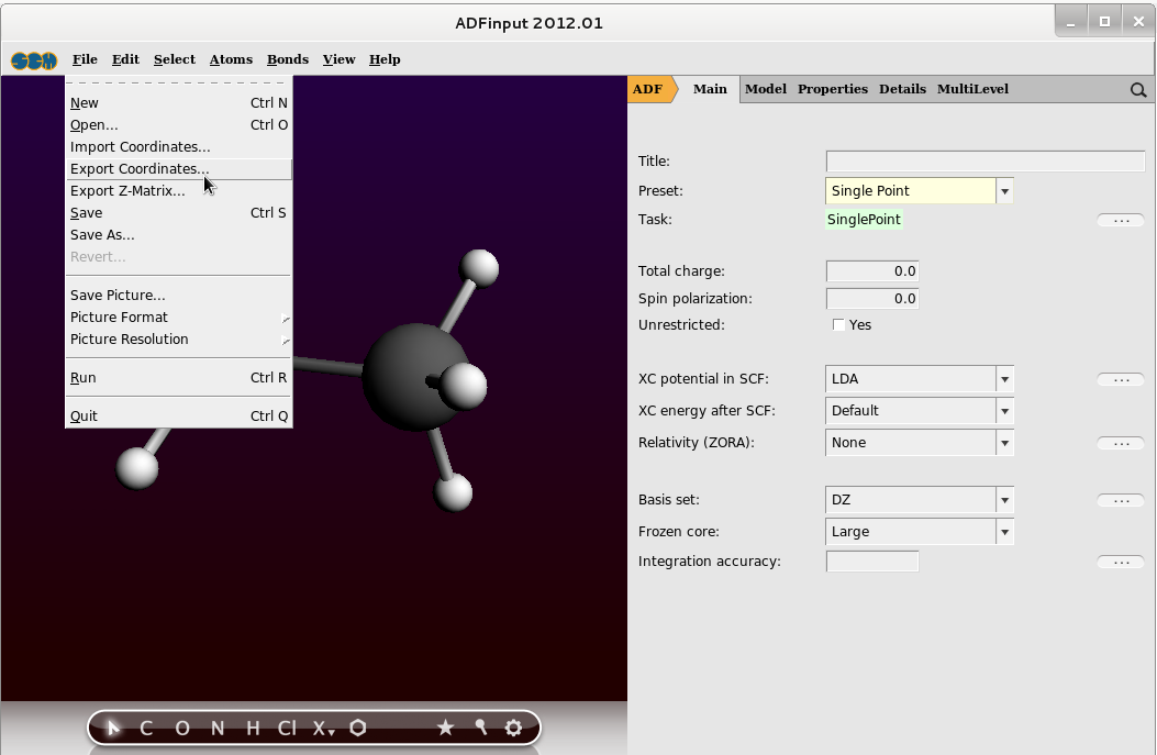 encontrarás File>Export Coordinates como se ve en la figura 2.1.4. - Copia el archivo ejemplo.adf a tu carpeta local. Cambiale el nombre a C2H6. usuario@maquina$ mv ejemplo.adf c2h6.adf -