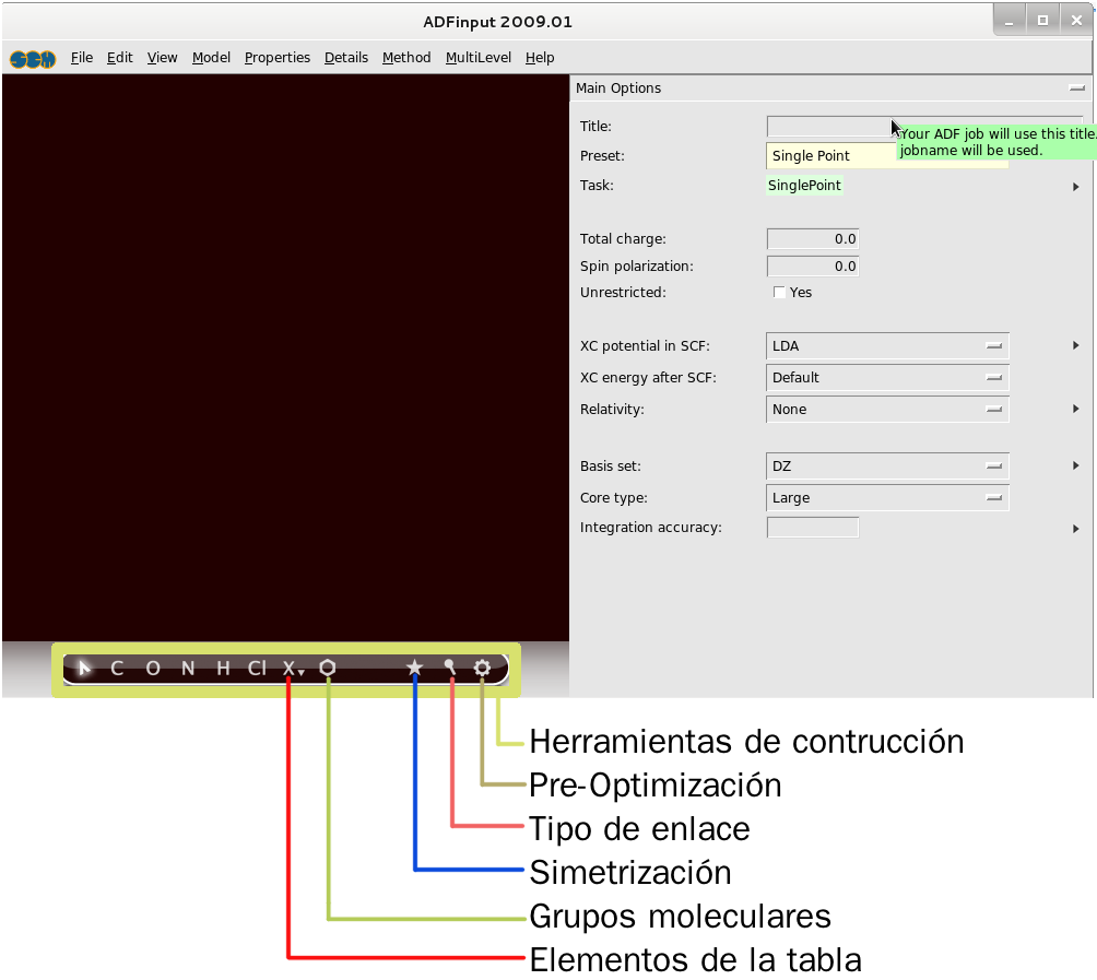 utilidades. Pre-optimización: Ingresa las coordenadas dadas y minimiza la energía con teorías de mecánica clásica. Tipo de enlace: Permite modificar el orden de enlace entre átomos. Simetrización: Utiliza un algoritmo para buscar el grupo puntual mas cercano de la molécula. Elementos de la tabla: Muestra los elementos de la tabla periódica para contruir la molécula. |  Figura 2.1.1 | 2.1.2 Construcción de la molécula de agua. -