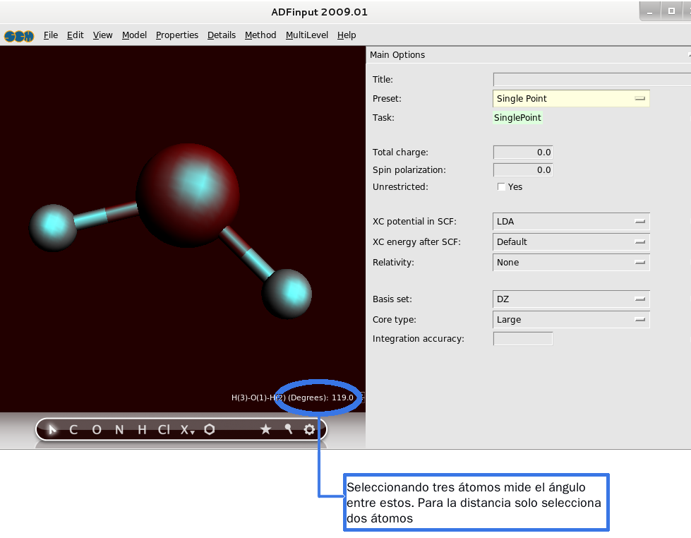 alli aparecerá una representación del átomo de oxígeno en rojo. - Seguido selecciona el símbolo del hidrógeno y colocalo en otro punto del área de construcción. - Familiarizate con los movimientos de ADF-GUI. - Deselecciona los elementos y coloca otro hidrógeno cerca del oxígeno. -