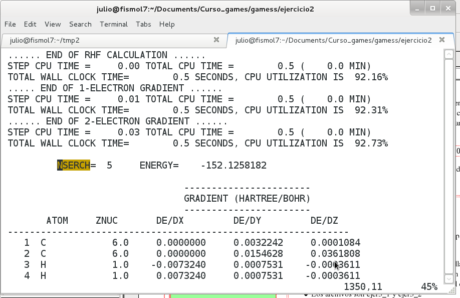 - Terminado el cálculo para encontrar los datos de mínima energía buscar la cadena de caracteres /NSERCH