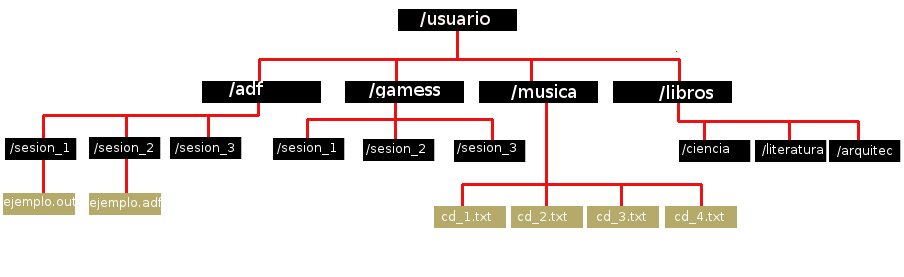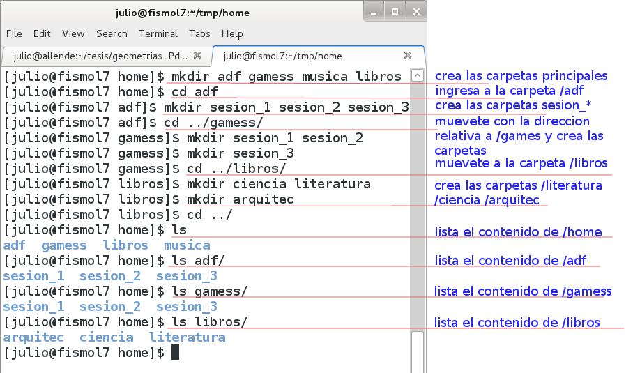 - En tu carpeta principal crea las siguientes carpetas: adf, gamess, musica, libros.