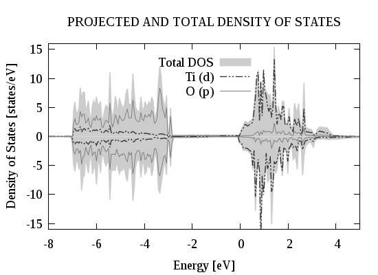 # Grayscale PDOS set style line 5 lt 1 lw 1.2 pt 1 ps 0.9 lc rgb "gray80" set style line 10 lt 1 lw 1.0 pt 2 ps 1.1 lc rgb "gray50" set style line 11 lt 5 lw 1.4 pt 3 ps 1.1 lc rgb "gray20" plot "DOS0.dat" using 1:2 title "Total DOS" with filledcurve y1=0 ls 5 , \ "DOS0.dat" using 1:3 title "" with filledcurve y1=0 ls 5, \ "ti_dos.dat" using 1:6 title "Ti (d)" with lines ls 10, \ "ti_dos.dat" using 1:7 title "" with lines ls 10, \ "o_dos.dat" using 1:4 title "O (p)" with lines ls 11, \ "o_dos.dat" using 1:5 title "" with lines ls 11;