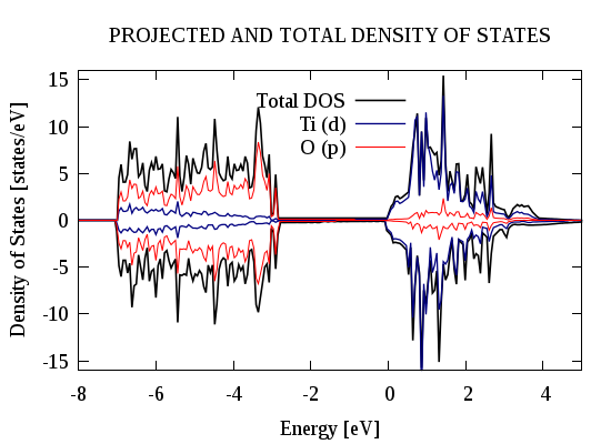 # Color line styles set style line 5 lt 1 lw 1.2 pt 1 ps 0.9 lc rgb "black" set style line 10 lt 1 lw 0.9 pt 2 ps 1.1 lc rgb "red" set style line 11 lt 1 lw 0.9 pt 3 ps 1.1 lc rgb "navy" plot "DOS0.dat" using 1:2 title "Total DOS" with lines ls 5 , \ "DOS0.dat" using 1:3 title "" with lines ls 5, \ "ti_dos.dat" using 1:6 title "Ti (d)" with lines ls 10, \ "ti_dos.dat" using 1:7 title "" with lines ls 10, \ "o_dos.dat" using 1:4 title "O (p)" with lines ls 11, \ "o_dos.dat" using 1:5 title "" with lines ls 11;