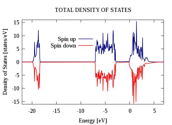 Now to plot the total density of states change the name file DOS0 to DOS0.dat which contains the total sum of states. First column is the energy, second are the spin up states, and the third are the spin down states of the system.
