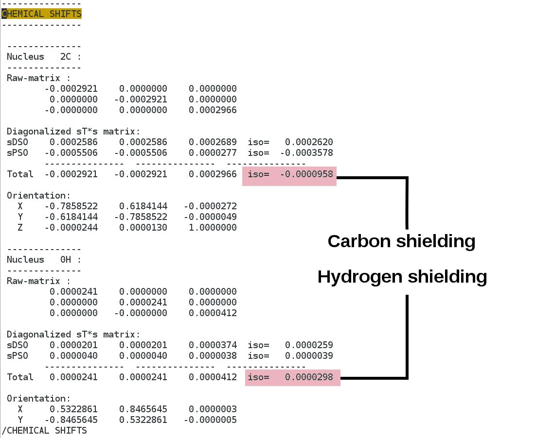 There you will find the orientation and egienvalues of the tensor. The total isotropic shielding is reported as shown in figure 3.3.1.