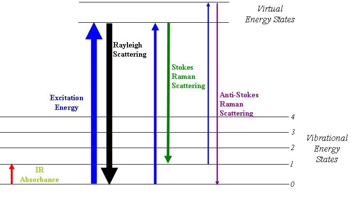 For polarizable molecules, the incident photon energy can excite vibrational modes of the molecules, yielding scattered photons which are diminished in energy by the amount of the vibrational transition energies. A spectral analysis of the scattered light under these circumstances will reveal spectral satellite lines below the Rayleigh scattering peak at the incident frequency.