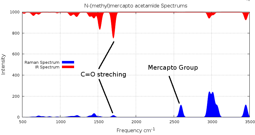 Figure 2.8.1 shows a comparison between the IR and Raman Spectra. We can see that IR do not show the normal mode of vibration of the mercapto group.